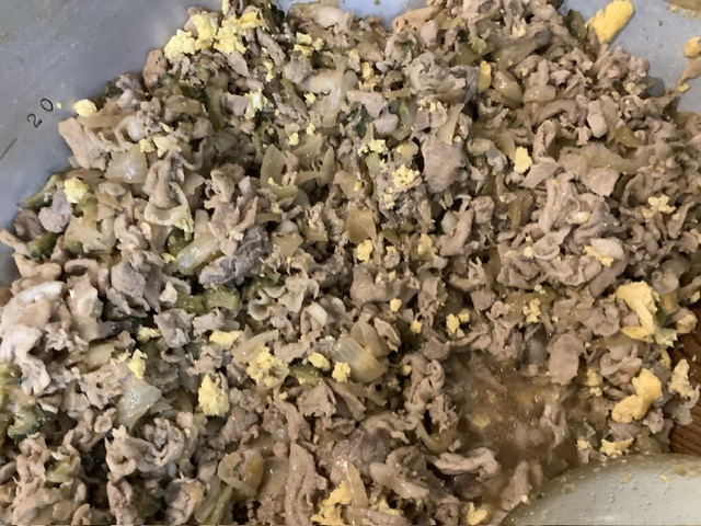 一真の豚肉、ゴーヤ、玉ねぎ、ヤブサメファームの卵、みじん切りにした生姜、酒、きび糖、薄口醤油を入れ、炒めました。