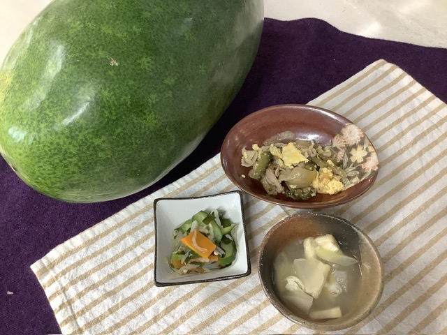 給食室前には大きな“冬瓜”の展示もあります。送迎の際に、是非見に来てください。触ったり重さを感じてみてくださいね♪