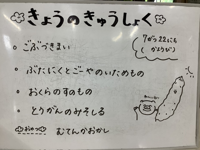 今日は大暑(たいしょ)です。大暑とは、二十四節気の一つで、一年で最も暑さが厳しい時期のことです。厳しい暑さに立ち向かうため、スタミナ回復の食べ物が欲しくなる大暑。今日の献立には、ゴーヤ、オクラ、冬瓜と夏野菜がたくさん入りました。夏野菜には疲労回復効果があります。暑い夏をのりきるために、ご家庭でも夏野菜を多く取り入れてみてくださいね♪