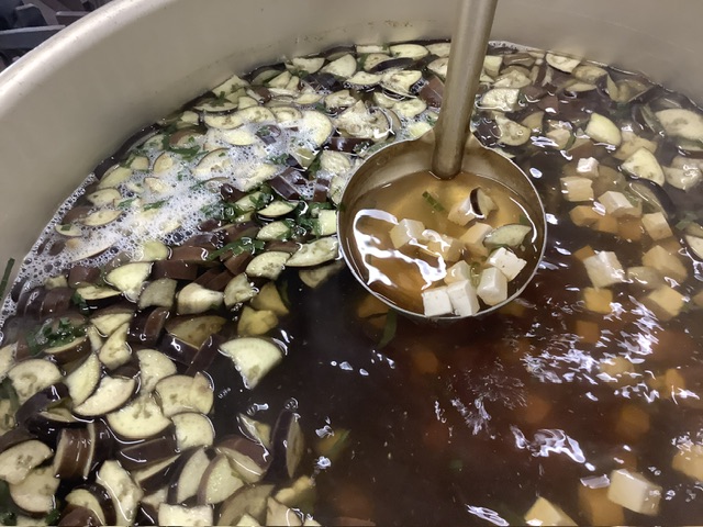 昆布とかつお節から取った出汁に、木綿豆腐・35ファームのなす・のはら園で収穫したしそが入ったすまし汁です。火にかけることで色や香りが飛びやすいしそは、2度に分けて鍋に加えています。