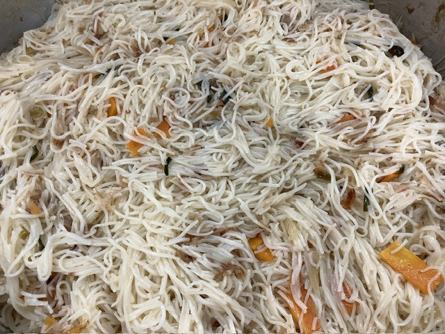 そうめん・ツナ・にんじん・玉ねぎ・にら・ピーマン・しめじを混ぜて炒めました。