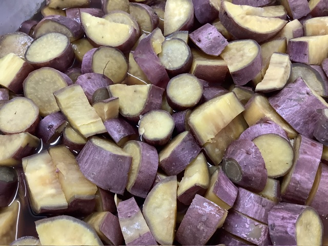 綺麗に洗ったさつまいもを皮付きのまま切り、昆布とかつお節でとった出汁、濃口醤油、きび糖、味の母、酒でゆっくりコトコト煮詰めます。