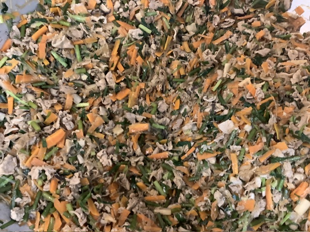 一真の豚肉、筍、にんじん、にんにくの芽、椎茸、ニラ、春雨、生姜、にんにくが入りました。