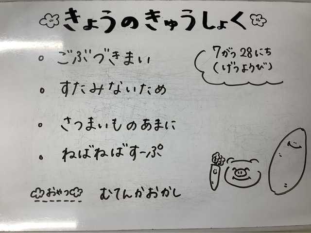 さつまいもの甘煮はこども達に大人気メニューです。ホクホク柔らかく仕上がったさつまいもは、皮も気にならず、美味しく食べられます。