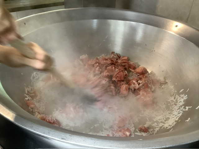 大きな回転釜で、調味料以外の水を加えずに作ることが錦ヶ丘流✨