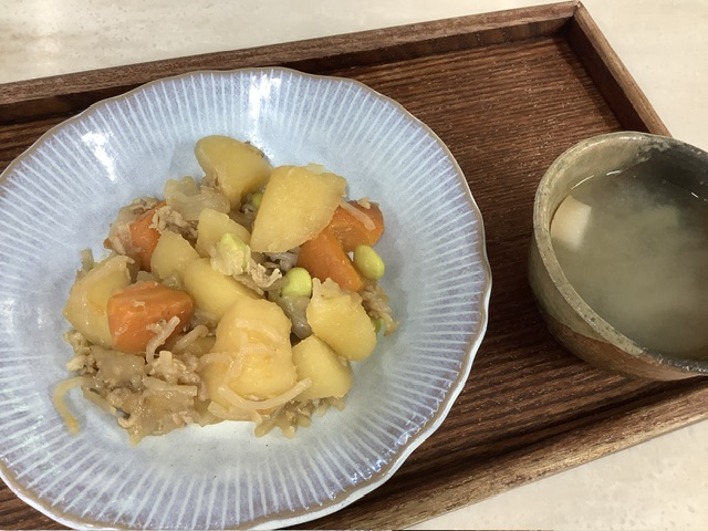 具材は、大きめに切ったじゃがいも・にんじん・玉ねぎ・豚肉・しらたき・枝豆が入っています。