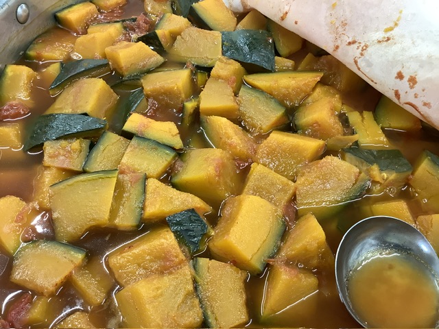 昆布、鰹節でとった出汁に、調味料で味付けをしたら、35ファームのかぼちゃ、カットトマトを一緒に煮込みます。みずみずしいかぼちゃに、さっぱりとしたトマトが絡み、夏にぴったりのメニューとなりました。