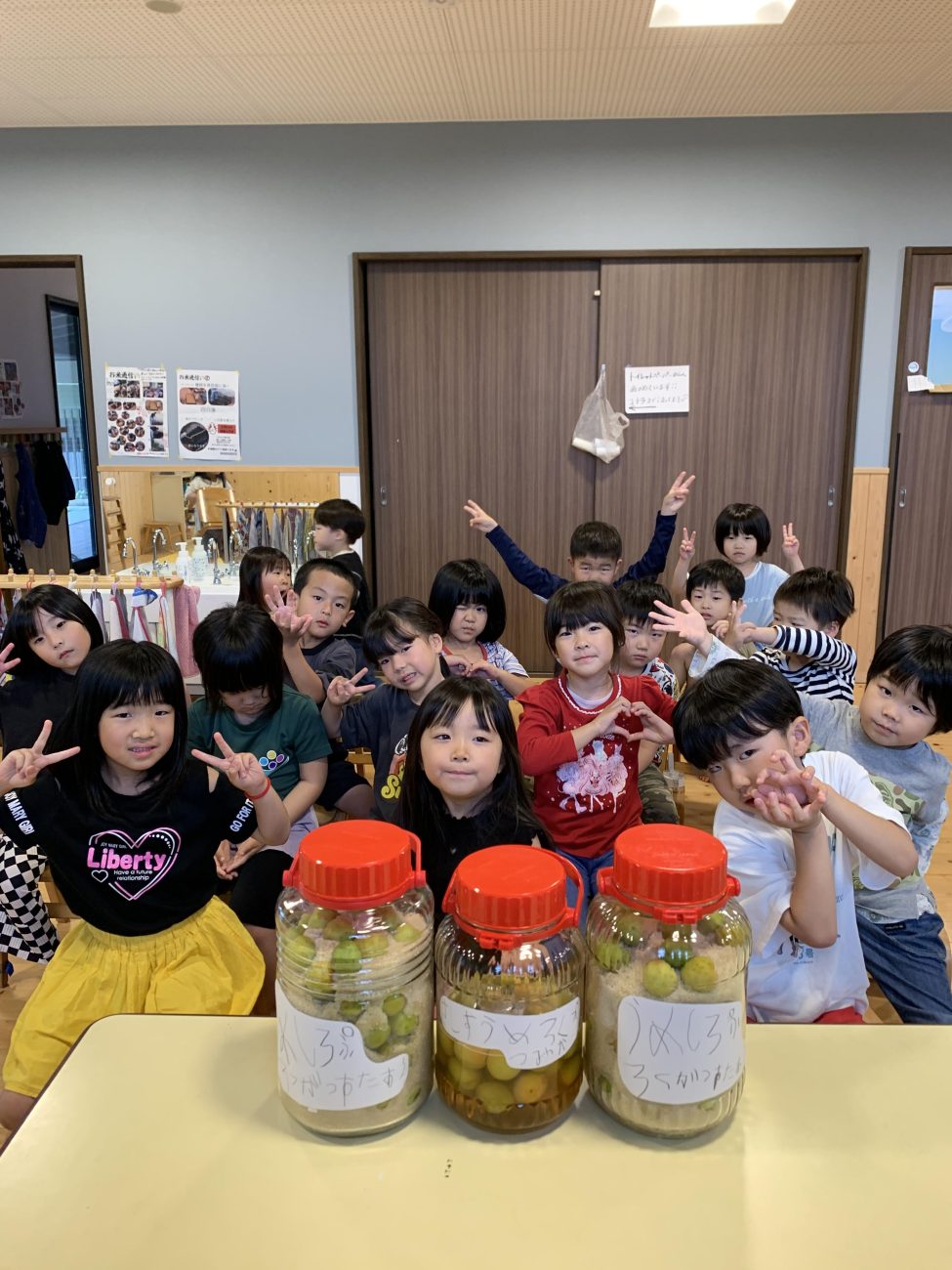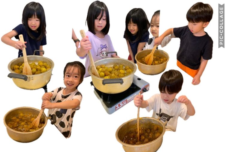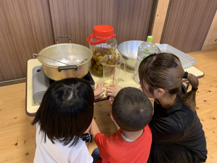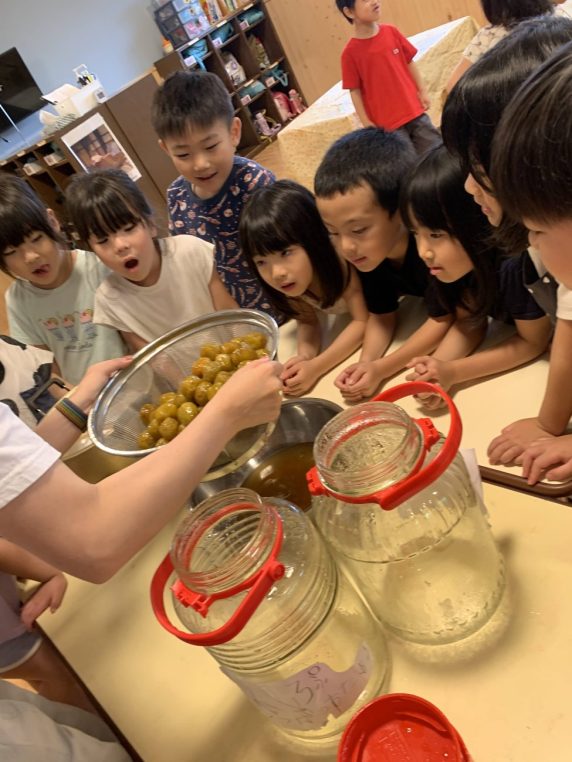 6月に梅仕事を行ないました。梅仕事では、梅シロップを作りました。「完成したら何を作る?」と子ども達と話し合い、さまざまな意見が出てきました。子どもが「作りたい」と思うものをできる限り作れるようまとめた結果、飴・ゼリー・梅ジャムピザ・かき氷の5つを作ることになりました。