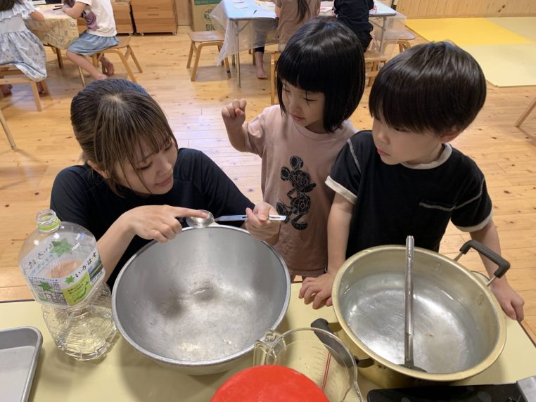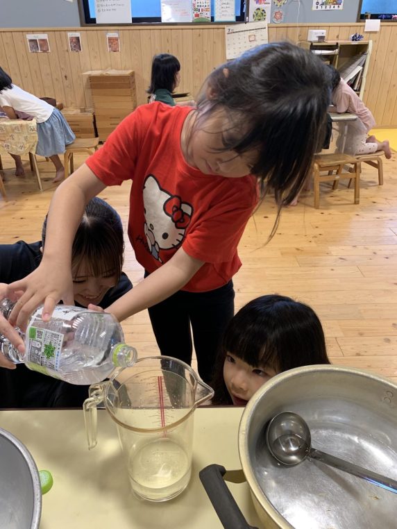 クッキングの中でも特に、梅ゼリー作りでの学びが印象的でした。梅ゼリー作りでは、水やシロップを量る機会があったのですが、計量カップや計量スプーンなどを使ってそれぞれの分量を子ども達に量ってもらいました。初めて見る単位(cc、mlなど)に「なにこれ!」という表情をする子、「聞いたことある」「見たことある」という子などさまざまでした。「10は0が1個」「100は0が2個」と伝えると、決まった数字を見て「これが100だ」「見つけた!」と目を丸くして喜んでいました。