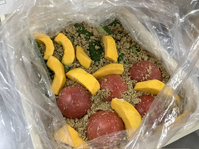 きゅうり・トマト・コリンキーは給食室手作りのぬか床に漬け込みました。トマトは、表面に爪楊枝で小さく穴を開けてから漬け込んでいます。