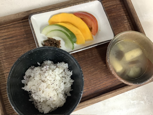 月に一度の「粗食の日」では、動物性たんぱく質を使用せず、野菜と穀物中心の一汁一菜からなる献立を提供しています。普段の食事に感謝する心を育てるねらいがあります。