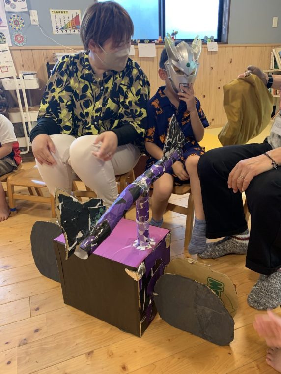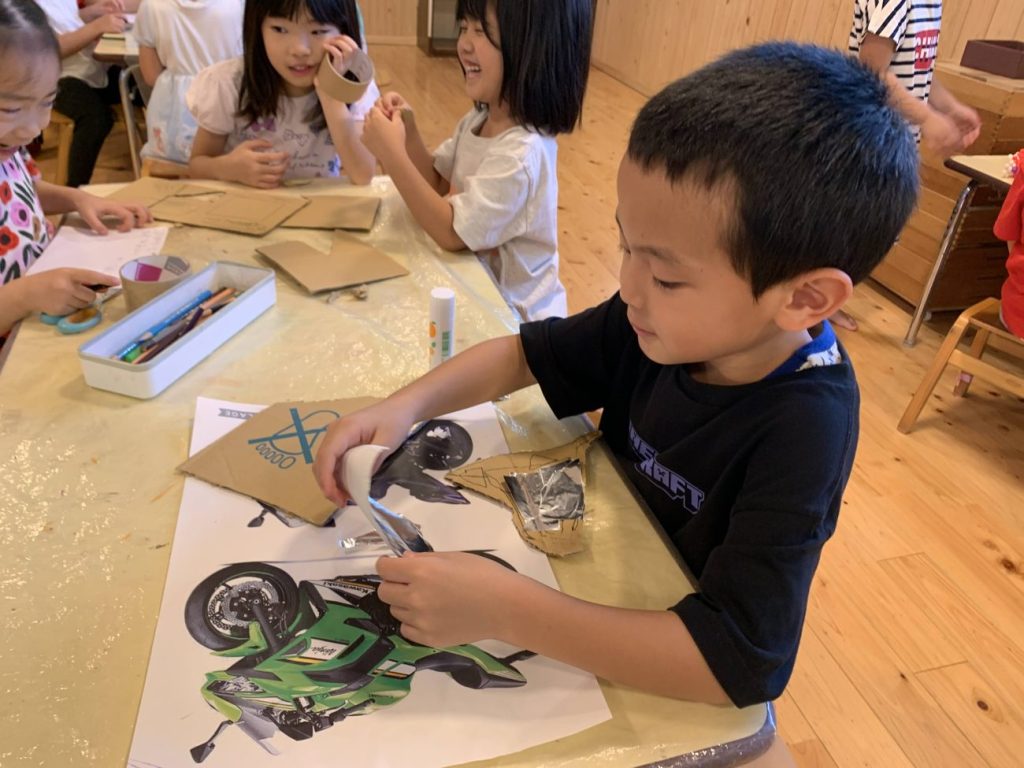また、バイクが好きな子には段ボールでバイクを作りました。実際に乗ってほしいという気持ちから、絵の具の使用を避けて(洋服についてしまうから)折り紙で色をつけるやり方を導いていました。作業の見通しを持てるようになった分、プレゼントをあげた後の見通しも持てるようになっていることに驚きました。