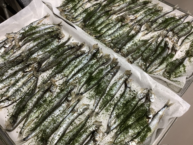 ししゃもに、青のりをたっぷり振りかけて焼きました。