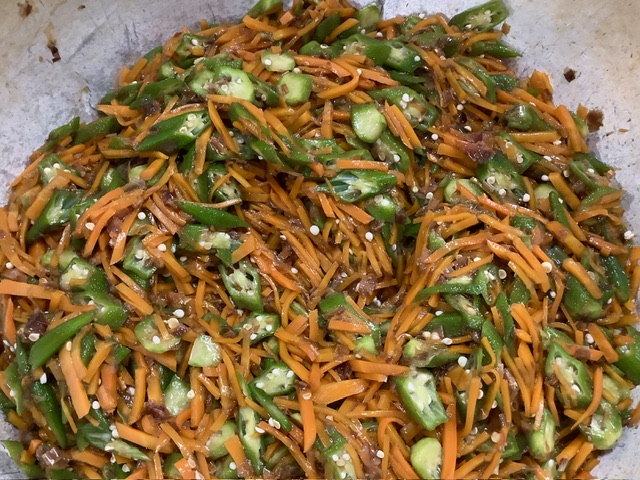 おくらとにんじんをスチームで加熱し、かつお節と濃口醤油で和えました。