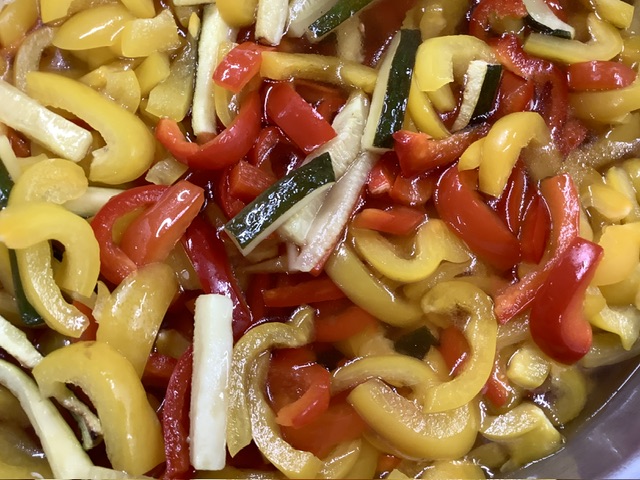 味を染み込ませやすくするために、パプリカはスチーム、ズッキーニはオリーブオイルをまぶしてオーブンで軽く焼き目をつけてから漬け込んでいます。