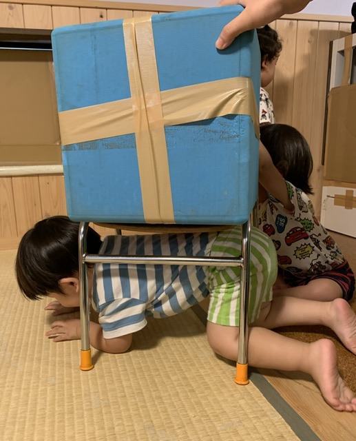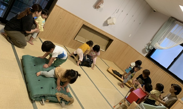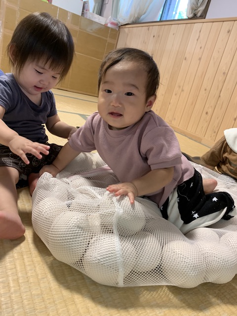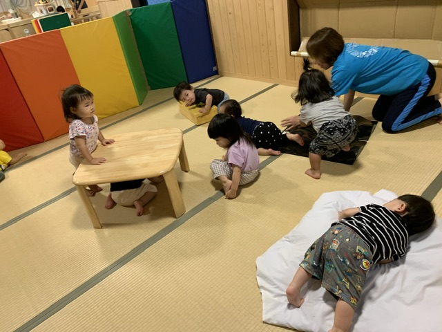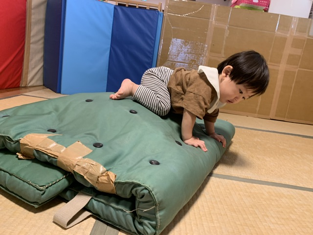 0・1歳児の子ども達でも自らから体を動かしたくなる遊びで、身近な道具で発達に合った遊び場を設置し、足裏で凸凹の刺激をたくさん経験させ、より良い発達を促すことを目的としています。