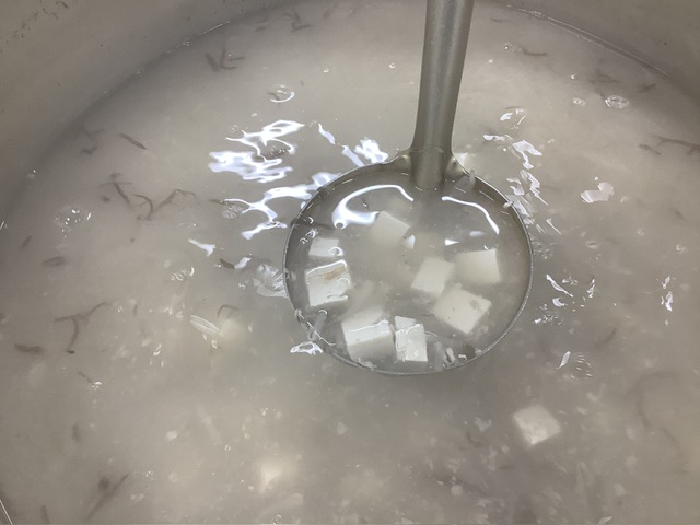 ふのりのみそ汁には、かつお・昆布・いりこでとったお出汁にもやし、木綿豆腐、ふのりが入り、美味しく仕上がりました。