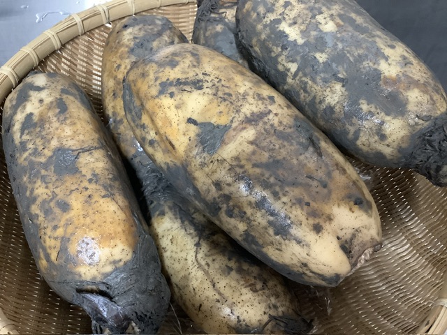 今日使用したれんこんは、泥付きのまま届けていただきました。表面に付いた泥が保湿剤の役割になり、れんこんの乾燥を防いでみずみずしい状態を保ってくれるのだそうです。