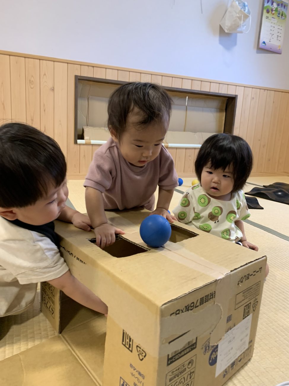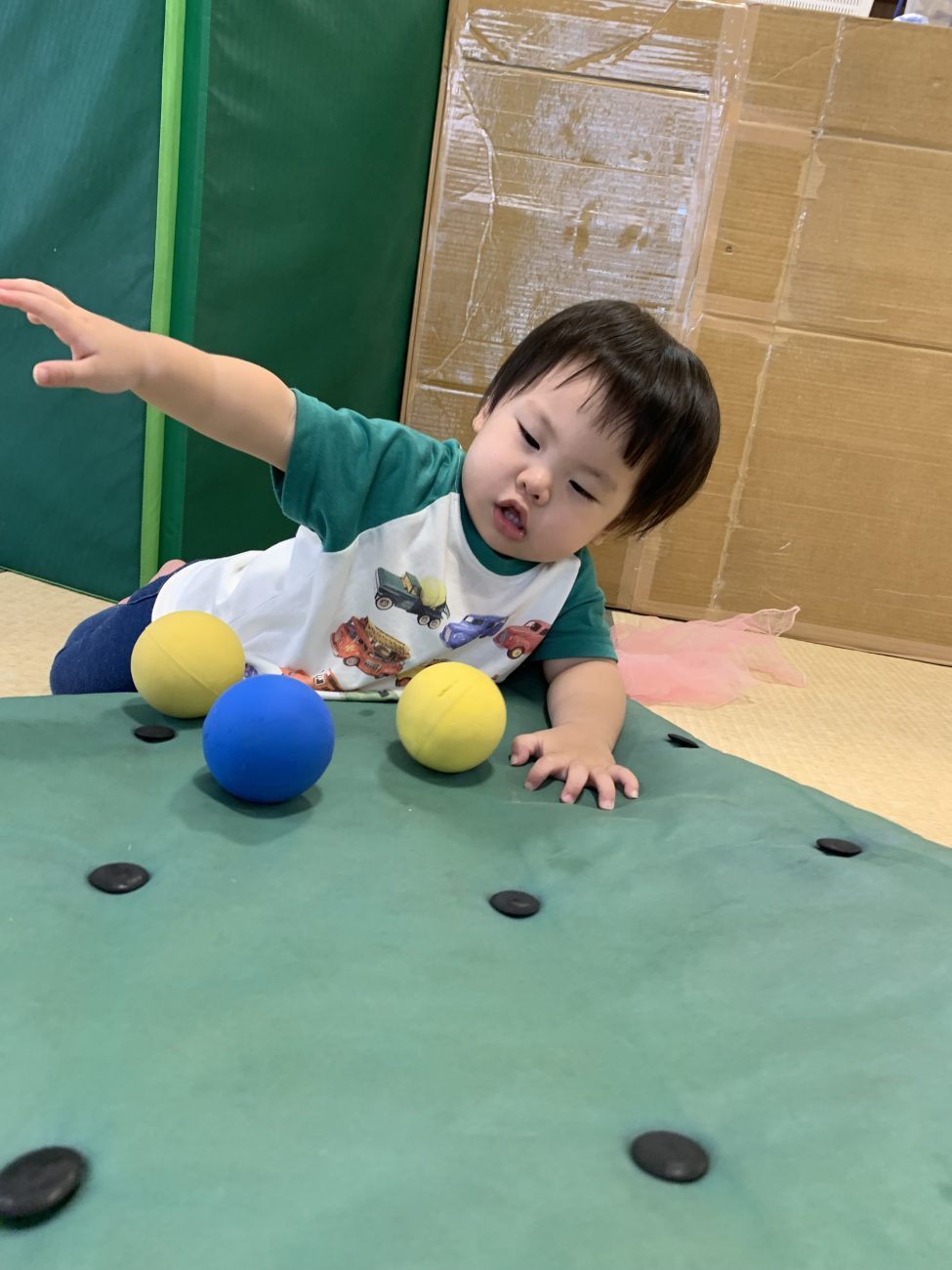 ママボールを通して、寝返り、ずりばい、ハイハイなどの動きが遊びの中で無理なく引き出されている姿がとても興味深く、遊びの環境をつくることで子ども達の運動意慾を刺激することの大切さを感じました。