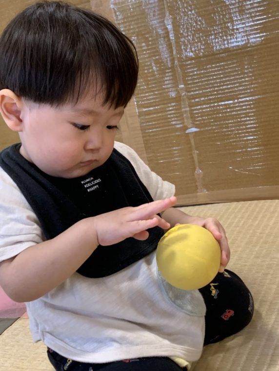ママボールは、とても柔らかく、子ども達が安心して触れることができます。手のひらや足の裏でボールをぎゅっと握ったり、指先でつまんだりすることで、触覚が刺激されています。
