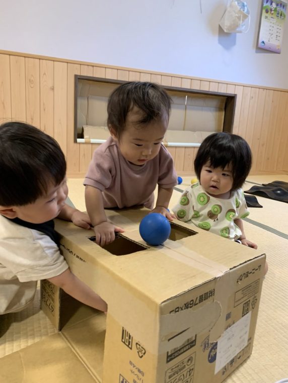 歩行が安定していない子ども達にも、保育者が目の前でゆっくりと動かすことでボールを追