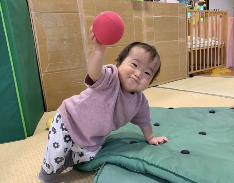 運動発達が著しい0歳児の子ども達には、ママボールで繰り広げられる遊びのすべてが貴重な経験、学びとなります。保育者として子ども達と心を通わせながら、様々な遊びを通して初めての経験を楽しんでいきたいです。