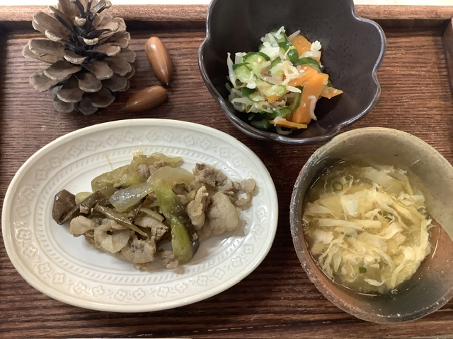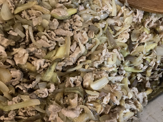 一真の豚肉、秋ナス、玉ねぎ、みじん切りにした生姜を、甘辛く炒めました。秋ナスは、スチコンで揚げ焼きにしてから加えています。