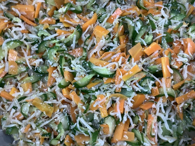 きゅうり、にんじん、もやしが入りました。酢味噌は給食室の手作りで、りんご酢、きび糖、麦味噌を混ぜ合わせるだけ。りんご酢は、まろやかな酸味が特徴で、こどもにも食べやすい仕上がりになります。簡単にできるので、ご家庭でも作ってみてくださいね。
