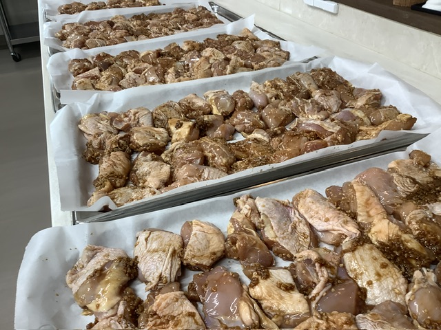一真の鶏肉に、給食室手作りの醤油麹を漬け込みました。醤油麹の味が、お肉に染み込み、ふっくらと柔らかく仕上がりました。