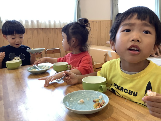 ちらし寿司は、普段あまり食べ慣れていないので、これまで残食も多く残ってきていました。どうしたら食べてくれるかなと、プラスと隣のこども園の給食チームで何度も話し合い、試行錯誤してきました。今日の秋鮭入りのちらし寿司は初めての提供でしたが、どの子も本当によく食べていました。何度もおかわりをする子や、普段食の細い子も「このご飯大好き〜」と、たくさん食べてくれました。たくさん食べてくれる姿に私たちもガッツポーズ!とても嬉しいでした。