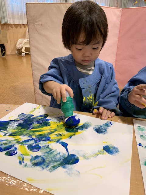 フェスティバルでは、感触遊びの一つとして絵の具遊びの作品も展示します。