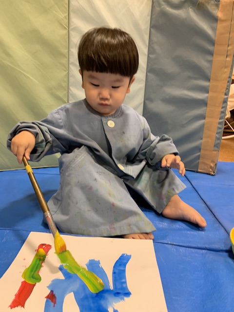 1歳児はタンポや筆などの道具や手で塗った作品など、夏頃から段階を踏んだ過程を作品にしてご覧頂きます。