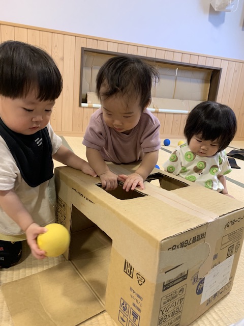 初めは触れることをためらったり、嫌がったりする子もいます。友だちや保育者と一緒に遊ぶうちに「触れてみよう」と手を伸ばすようになってきました。