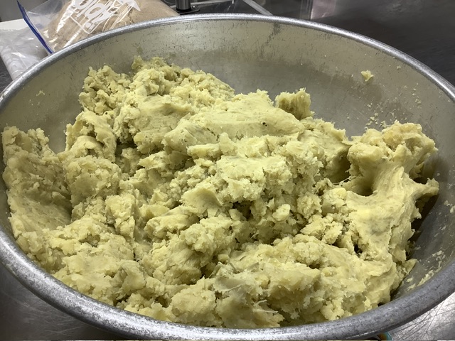 蒸した芋に、生クリーム、きび糖、バターを加えて、潰し混ぜ、俵形にします。