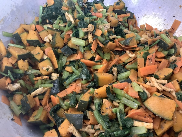 味付けは簡単でシンプルですが、小松菜のほのかな苦味とカボチャにんじんの甘み、ごまの風味で相性よく美味しく仕上がりました。