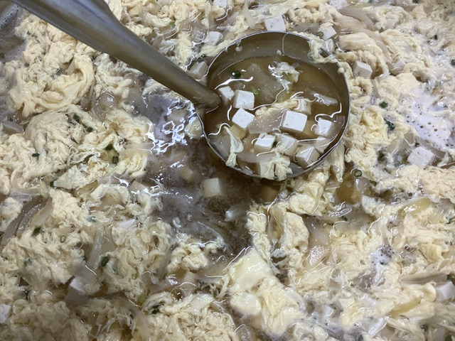 汁をしっかりと温め、かき混ぜてぐるぐると渦を巻いているところに卵を流し入れると、卵が汁全体にふわっと広がります。