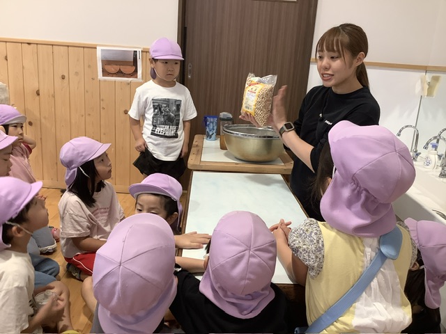 今日から2日間にわたって、さくら組がみそ作りを始めます。1日目となる今日は、まず大豆を水に浸けて一晩置く工程です。