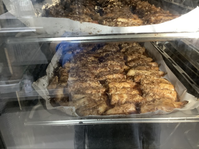 土佐焼きとは、鰹節をまぶした料理です。鉄板に並べたら、鰹節をたっぷりとふりかけて、スチコンで焼きます。