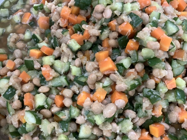 圧力鍋で煮た大豆、コロコロに切ったにんじんときゅうり、すりおろして火を通した大根を全て合わせて三杯酢で和えました。さっぱりと食べやすくお箸が進みます。