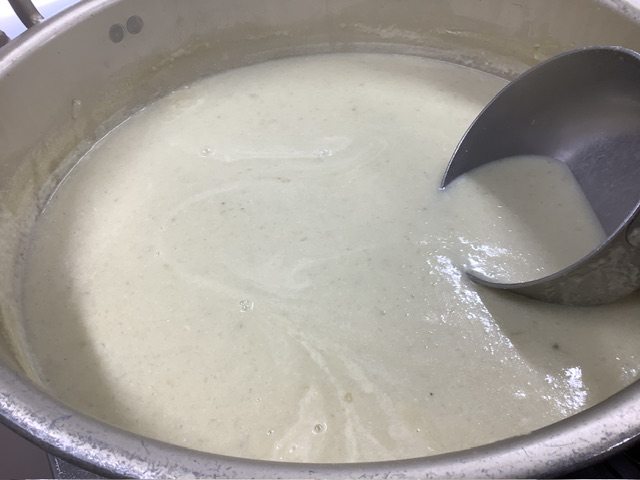 さつまいも、玉ねぎを茹で、ミキサーでペースト状にし、豆乳、生クリーム、玉ねぎ麹で味を整えました。玉ねぎ麹とさつまいもで甘さが引き立ち、美味しく仕上がりました。