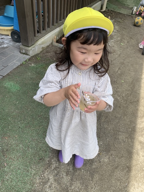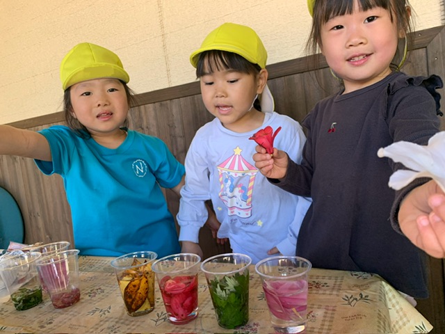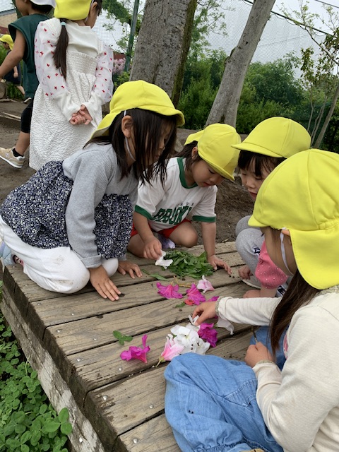 きく組(3歳児)の時から興味を持ち、楽しんできた色水遊び。もも組になってからも継続してやっている遊びの1つです。春には園庭の草花を集めてビニール袋に入れ、水を入れて揉んでみました。
