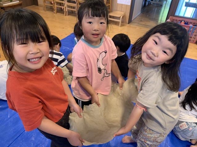 もも組では、粘土を使った活動を日常的に行なってきました。一人で自分のイメージを形にすることもあれば、数人で協力して一つのものを作ること、また、全員で粘土をこねたりたたいたりすることもありました。