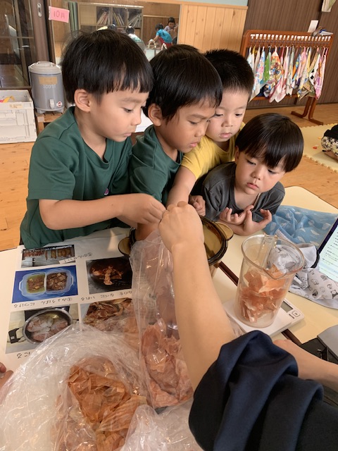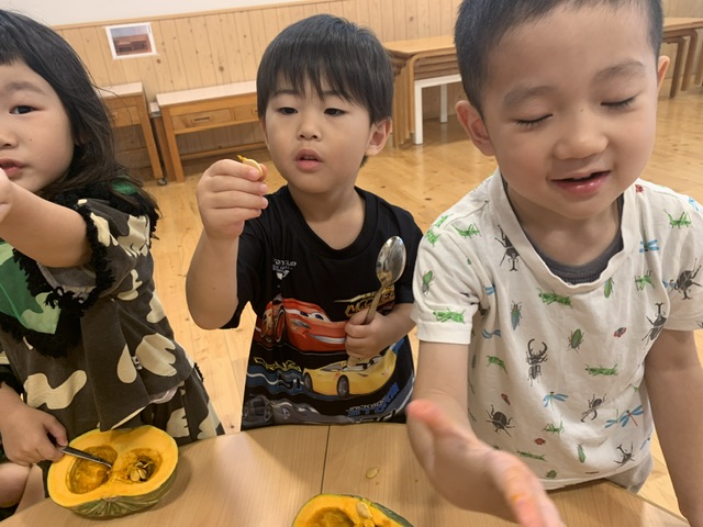 給食に使う野菜の下処理にも挑戦!これまで、かぼちゃの種取り、とうもろこしや玉ねぎの皮むきなどにも取り組みました。自分たちが皮をむいた食材が給食に使われているのを見ることで、「これもも組が皮剥いたよね」と友だちと会話をしながら味わったり、苦手な野菜も食べてみようとしたりする姿がありました。