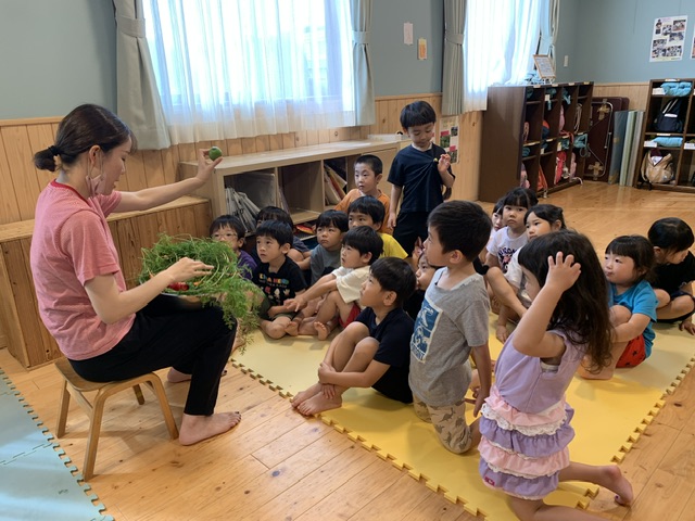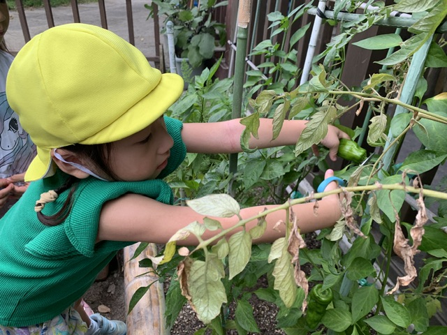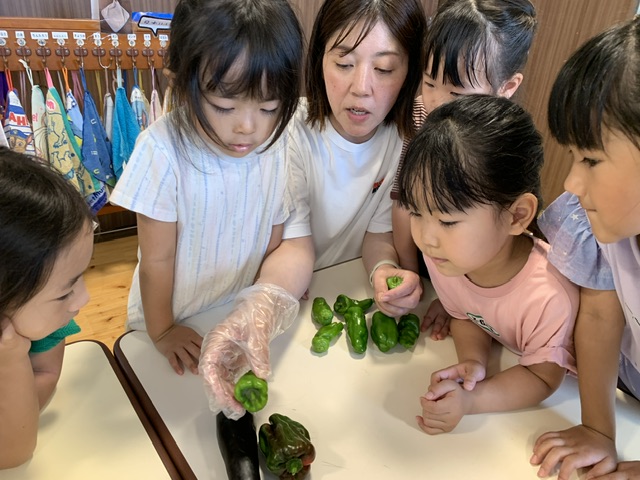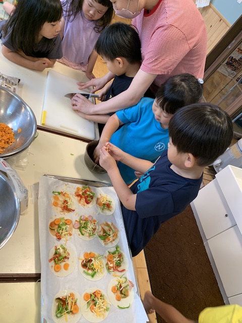 錦ヶ丘では食育のひとつとしてクッキングを積極的に行なっています。春には、梅仕事で梅シロップを作り、かき氷や梅ジャムを作りました。また、夏には、クラスで育てた野菜を収穫し、ピザを作りました。「ピーマン、すべすべしてる」「トマトってジュクジュクで切りずらい」などの言葉が飛び交いました。どちらも、食材に触れて手触りや匂い、味を直に感じる経験を得ることで、興味を持ってクッキングに参加していました。