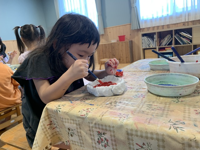 陶芸に向けて、紙粘土でお皿を作り、絵の具で色を塗ってみました。それまで感触遊びが苦手だった子どもも粘土の感触に慣れ、自分の作品に愛着を持って、絵の具で色を塗っていました。