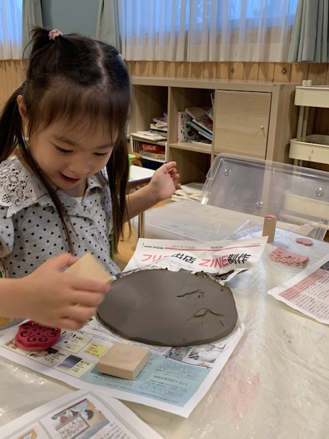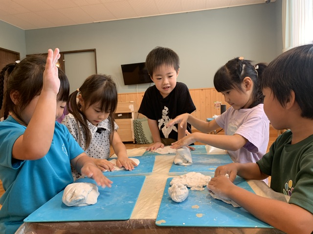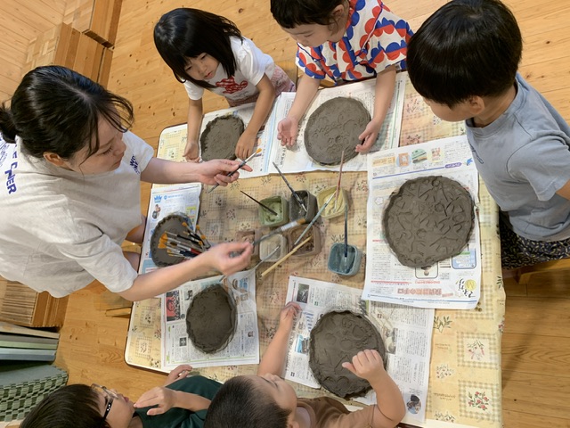 そんな中、粘土でピザとお皿を作っている子ども達がいました。それを見て保育者が「自分で食器(お皿)を作って自分達で作った料理をのせて食べてみる?」と、焼き物作りを提案しました。それから、焼き物のコップを見たり触ったり、陶芸作りの映像を見たりする中で、お皿を作ってみたいという声が大きくなり、陶芸の出張体験を依頼することにしました。