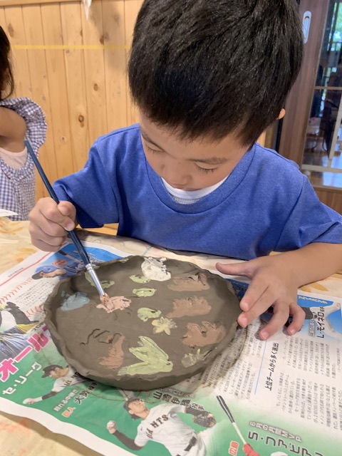 そして、9月に美山陶遊館(日置市)から講師の方を招いて、子ども達が手ひねりと絵付けをし、焼き物を作りました。陶芸体験では、これまで積み重ねてきた経験から感触に抵抗のある子どもの姿は無く、「紙粘土と一緒だね」と発言する子どももいたり、土の匂いや触り心地、絵付け体験など五感で感じながら思い思いの皿を作ることが出来ていました。