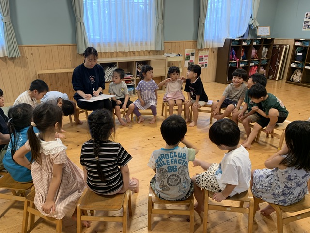 「自分達で作ったお皿で何をしたいか」のサークルタイムでは、「なにかのせたい」「ごはんのせたい」など意見がでて、これまでやってきたクッキングの活動からピザの案が出ました。しかし、一度しかピザ作りを経験していなかったため、美味しいピザを作るために何回か試作を重ねて深めていきたいこと、そのために、もも組以外の大人にも作ったピザを食べてもらい、意見を聞いてみるのはどうかと保育者が提案したところ、子ども達から「いいねー!」と賛同する声が。