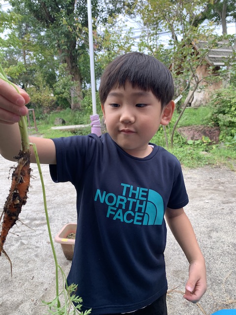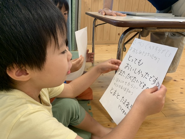 それからは、のはら園や園庭を探索し、ピザに使えそうな食材としてどんな野菜があるかをみんなで確認しました。人参やピーマン、なすやレモンなどがあり、それをもとにピザに使ってみたい野菜(具材)を話し合いで決め試作をしました。そして、他クラスの担任や錦坤館チーム、給食室チームにも子ども達が考えた質問を書いたアンケートを配り、その結果を共有しました。