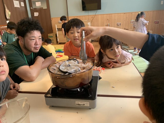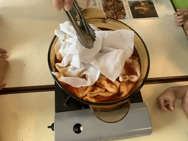 日頃から給食の下処理の手伝いで玉ねぎの皮を剥いていた子ども達。「玉ねぎの皮で染まった!」「ゴムで縛るの難しいな」などのつぶやきが聞かれました。玉ねぎの皮で染めた布をどうやって使いたいか子ども達に聞いたところ、「頭に巻きたい」「手につける」などいろんな思いがあることが分かりました。自分達で染めた布がカフェでどのように使われているかも楽しみにしていてください。